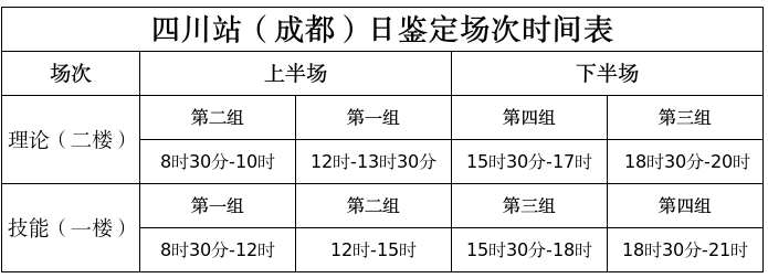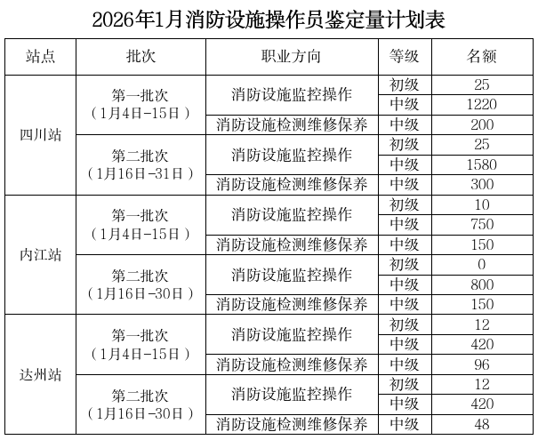 四川省消防鉴定站2026年1月消防设施操作员职业技能鉴定考试公告四川省消防救援总队消防行业职业技能鉴定站2026年1月消防设施操作员职业技能鉴定考试公告 根据消防行业职业技能鉴定指导中心消防设施操作员职业技能鉴定工作安排(请参见“消防职业技能鉴定考试网”https://xfhyjd.119.gov.cn/#/index/),结合工作实际,四川省消防救援总队消防行业职业技能鉴定站、内江分站、达州分站计划开展消防设施操作员职业技能鉴定考核工作,现将有关事项通知如下(建议考生关注四川省消防救援总队训练与战勤保障支队公众号获取最新鉴定咨询): 一、现场抽查复核报名资料 为进一步贯彻执行消防设施操作员职业技能鉴定报名告知承诺制,核验考生践诺情况,按照消防行业职业技能鉴定指导中心要求,四川省消防消防救援总队消防行业职业技能鉴定站及省内各分站,自2025年10月批次起在考试当日开展现场资料复核工作。 (一)抽检范围 鉴定站将在本批次准考证生成后,在本批次考生名单中按比例随机抽选核查对象,其中补考考生不纳入此次抽检范围。 (二)事先通知抽检对象 鉴定站事先通过鉴定站专线电话或短信提醒方式,通知确定的抽检对象,告知核查内容和应携带的资料;考生若有疑问可通过鉴定站咨询专线电话(02889133916)详询。 (三)备检资料要求 抽检对象应按通知要求,于考试当日携带报名资料原件配合现场复核,若资料原件遗失,应提前联系有关单位补办或开具有效证明。 (四)资料丢失、损坏等情况的处置办法 资料丢失、损毁等特殊情况,考生应提前联系鉴定站申请延期考试,延期办理方法参见本文“第七条、考前准备事项”中有关内容。 凡发现提供虚假承诺、伪造证明材料或通过其他非正当途径报考的行为,经查证属实后将立即取消其考试资格,并依法依规追究相应责任。 二、预计鉴定名额 说明:总名额含补考考生,不限制补考报名数量,补考报名先于考生报名;补考场次先于新考生场次。 三、考务工作时间安排 (一)第一批 补考报名时间为12月16日至18日; 缴费时间为12月21日至23日; 预选时间为12月25日至27日; 准考证下载打印时间为12月28日以后。 (二)第二批 补考报名时间为1月1日至3日; 缴费时间为1月6日至8日; 预选时间为1月10日至12日; 准考证下载打印时间为1月13日以后。 (三)续增批次 因正式报名期间,考生逾期未交费而产生的剩余名额,将通过系统按照预报名排位依次续增。 续增批次将于正式批次“预选时间”结束后开始,进入续增批次的考生,将收到短信通知。 续增考试场次时间原则上设置在本批次时间段的末尾,以便考生备考,考试时间将由系统自动生成,考生不可选择。 四、报名标准及要求 (一)报名标准 依据《国家职业标准编制技术规程(2023年版)》有关规定,消防设施操作员职业技能鉴定申报条件作如下调整: 1、具备以下条件之一者,可申报五级/初级工: ①年满16周岁,拟从事本职业或相关职业工作;②年满16周岁,从事本职业或相关职业工作。 2、具备以下条件之一者,可申报四级/中级工: ①累计从事本职业或相关职业工作满5年;②取得本职业或相关职业五级/初级工职业资格(职业技能等级)证书后,累计从事本职业或相关职业工作满 3 年;③取得本专业或相关专业的技工院校或中等及以上职业院校、专科及以上普通高等学校毕业证书 (含在读应届毕业生)。 本次调整自2024年3月15日起执行 (二)职业能力特征的要求 考生应具有较好的观察、分析、判断、表达和计算能力,空间感、形体直觉、色觉、视觉、嗅觉、听觉正常,四肢健全,手指、手臂灵活,动作协调。 五、考试时间安排 (一)四川站(成都) 四川站(成都)在原有上午、下午鉴定场次基础上,增设中午和夜间鉴定场次,单个考核日最多安排165人考核。内江站、达州站日鉴定场次安排不变。 1.新考生 按照准考证上“理论考试时间”准时到场(技能考试时间显示为“机动”),到场后服从现场安排,全部科目当日内考完,具体鉴定场次时间参见下表。 2.补考考生 按照准考证显示时间准时到场。 (二)内江站 每日考试设置时段及规则如下:理论和技能考试于一天内完成。于考试当日上午进行理论考核的考生,于当日下午进行技能考核;于考试当日下午进行理论考核的考生,于当日上午进行技能考核。上午理论/技能鉴定时间:08:40,下午理论/技能鉴定时间:14:30。 (三)达州站 每日考试设置时段及规则如下:理论和技能考试于一天内完成。于考试当日上午进行理论考核的考生,于当日下午进行技能考核;于考试当日下午进行理论考核的考生,于当日上午进行技能考核。上午理论/技能鉴定时间:09:00,下午理论/技能鉴定时间:14:10。 (四)关于名额增补 因正式报名期间,考生逾期未交费而产生的剩余名额,将通过系统增补,增补名额由预报名审核通过人员库中依次按序递补,同时发送短信通知考生缴费及预选考试时间,流程与正常报名基本一致,请参照短信提示进行操作。 增补考试的安排,原则上设置在本批次时间段的末尾,以便考生备考,考试时间将由系统自动生成,考生不可选择。考生可提前登录报名系统查看排名,并做好准备。